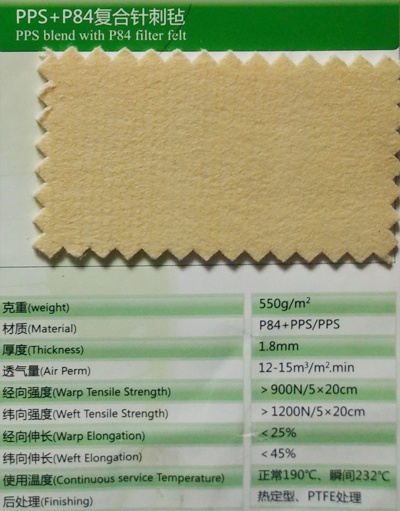 This filter material made from fiberglass mix with P84 fiber. P84 good at high temperature resistance also have anti-hydrolysis and anti-hydrolysis and anti-oxidation performance. The fiber section is leaf-shape which improve filtering efective.P84 compound felt works at 260℃,has great wearing resistance,great twist esistance and great anti-corrosing performance. Applied insteel,cement,casting,waste incineration,coal fried power plant industry,ect.